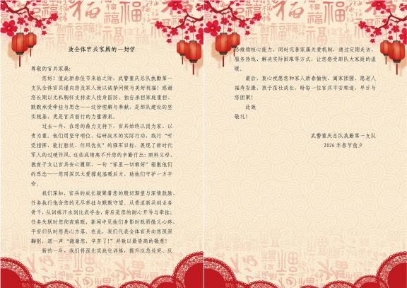 尊敬的叔叔阿姨,见字如面。新春的脚步悄然而至,孩子们在军营又长大了一岁。或许您总惦记着他们训练累不累、吃得习不习惯,今天我们提笔写下这封信,既是想和您说说孩子的成长进步,更想和您并肩携手,让这份“家育共管”的温暖,陪孩子走好军旅每一步。