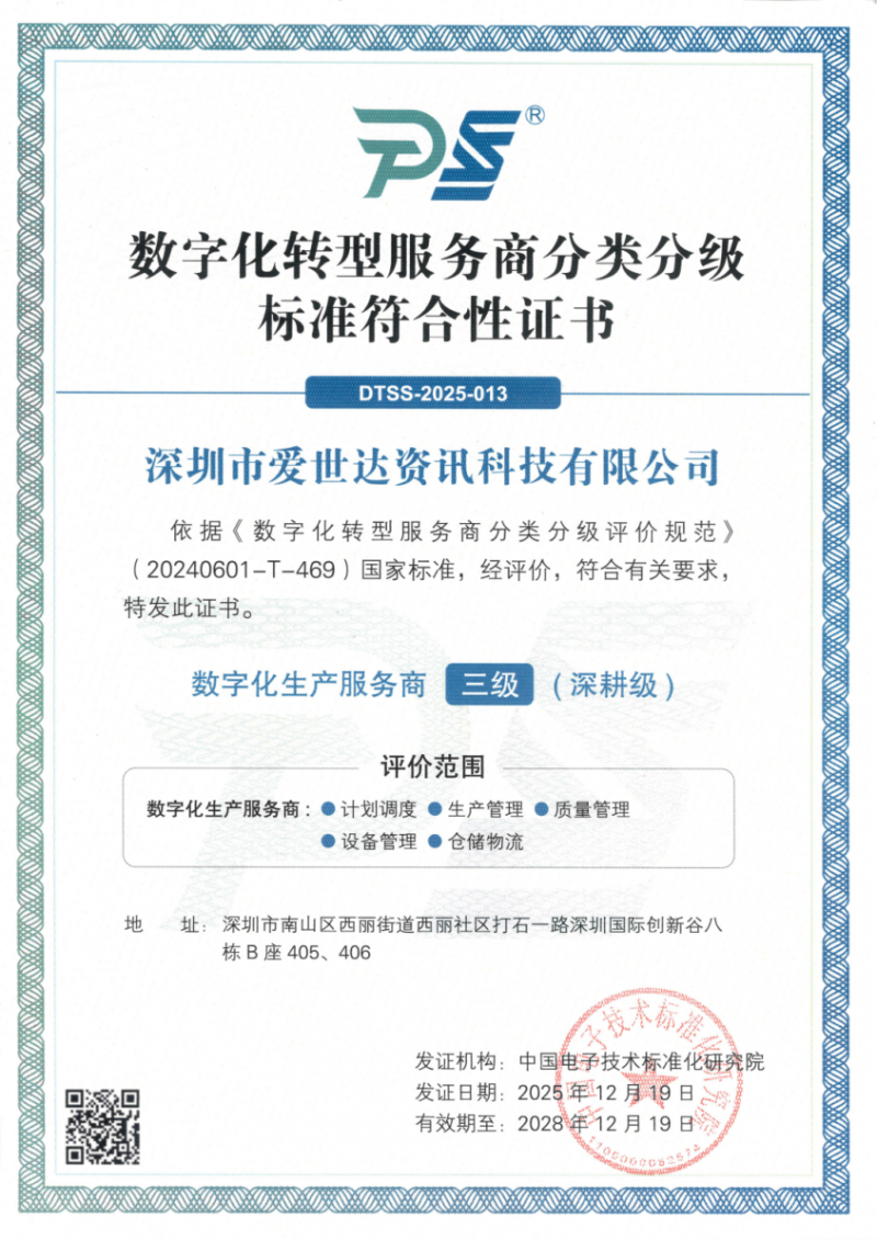 同期,爱世达成为首批通过数字化转型服务商分类分级(DTSS)标准符合性评估的企业,获颁DTSS数字化生产服务商三级(深耕级)资质,跻身全国数字化转型服务领先梯队;同时获评深圳市中小企业产业链赋能 “链式产品与服务” 企业,入选CMMM认证智能制造能力成熟度咨询机构;其“Allstar数字车间管理系统”获评“高质量软件产品”,被认定为制造业重点行业应用软件。