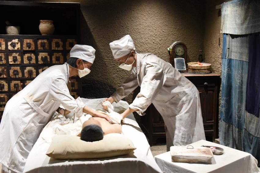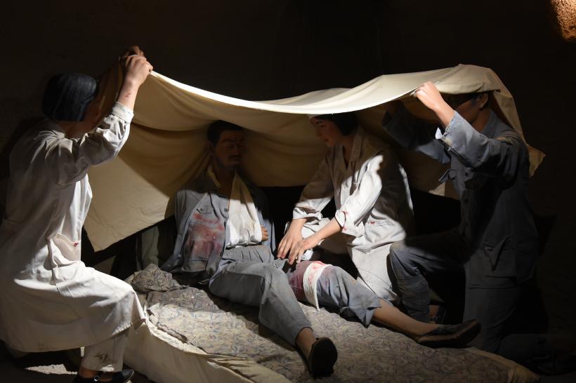 第二部分主要以场境复原的形式,在地下“病房”,再现当年地下医院医护人员精心救治照顾伤病员,他们以高度的革命乐观主义精神,度过艰难时光,成功康复重返抗日战场。