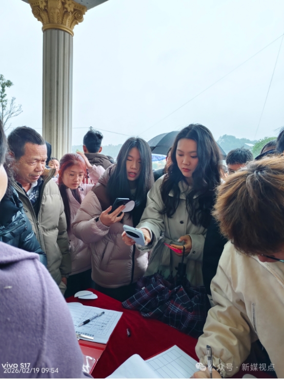 尽管寒雨淅淅沥沥,广大乡亲们的热情却丝毫不减。撑伞的、戴斗笠的,把现场围得满满当当。台下坐着贴着号码牌的男女嘉宾,100多号人,90后占了大半,80后十来个,00后也不少。