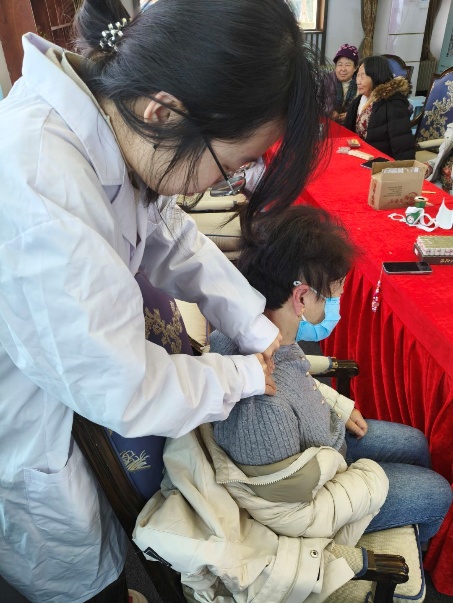 在挖掘传承红医精神的同时,服务队将专业实践与服务群众紧密结合,开展系列惠民服务活动。在社区物业中心,队员们为社区老人提供测量血压、压耳豆、肩颈按摩等爱心义诊服务,耐心解答日常养生、慢病管理等问题,针对老人普遍存在的失眠、高血压、食欲不振等健康问题及健康误区,结合专业知识提供饮食调理、穴位按摩等个性化健康建议。在社区会议室,服务队开展红医精神以及中医药健康科普宣讲,通过PPT演示、现场示范等方式,向居民讲解中医养生知识、常见疾病预防调理方法,普及艾灸、压耳豆等简易中医技法,让中医药智慧走进寻常百姓家。
