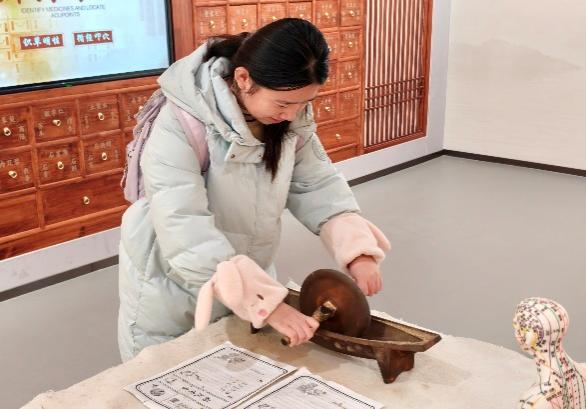 活动伊始,志愿服务队首站走进扁鹊文化博物馆和扁鹊文化主题公园,开启中医药文化寻根之旅。队员们亲手操作传统中药碾药器具,沉浸式体验中医药炮制技艺,通过参观中医药文物、古籍文献,系统梳理中医药发展脉络,深刻领悟扁鹊“望闻问切”诊疗方法和“治未病”预防思想的时代价值,明晰红医精神是中医药“以人民为中心”理念的延续与升华。