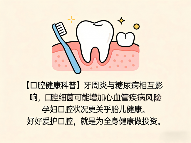 您知道吗?口腔健康远不止关乎牙齿。现代医学证实,牙周炎与糖尿病相互影响,口腔细菌可能增加心血管疾病风险,孕妇的口腔状况更与胎儿健康密切相关。维护口腔健康,是对全身健康的重要投资。