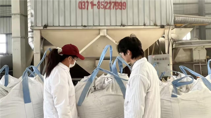图为团队成员检查固化剂成品吨袋包装(刘翔摄)