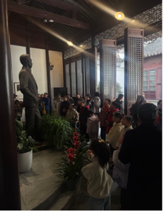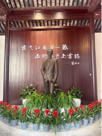 步入祠堂第二进,一尊古铜色的瞿秋白石膏像赫然矗立,身姿矫健,神采奕奕。雕像背景屏风上镌刻着瞿秋白的诗句:“我是江南一燕,为衔春色上云梢”。这句诗生动展现了青年瞿秋白儒雅书生的气质和投身革命、呼唤光明的远大抱负。小组成员们在雕像前久久驻足,被这位从常州走出的革命家早年的凌云壮志深深打动。