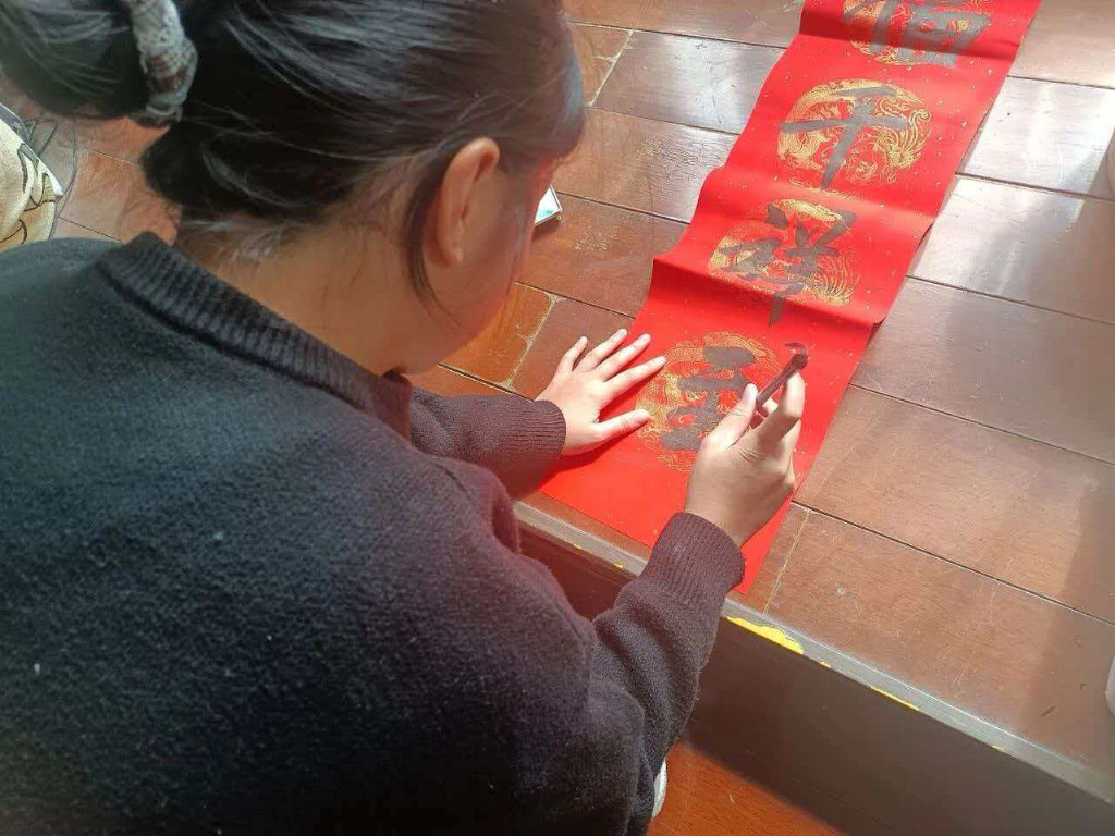 活动期间,实践队员分组开展指导,兼顾专业性与趣味性。讲解环节,队员们用通俗的语言,向孩子们介绍春联的对仗技巧、年画的吉祥寓意,重点解读马年“马到成功”“童心逐梦”的美好内涵,搭配优秀作品展示,快速激发孩子们的创作热情。书写环节,队员们手把手纠正孩子的握笔、运笔姿势,从横、竖、撇、捺的基础笔画教起,耐心指导孩子们临摹、创作,对书写较慢、掌握不佳的孩子,采取“一对一”帮扶,鼓励他们大胆下笔,在笔墨流转中感受汉字的韵律之美。