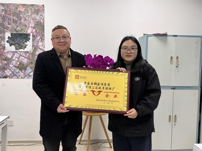 2月9日,龙泉驿区大面街道龙华社区将“爱心企业”荣誉牌授予中建西部建设一公司娇子厂,以表达对娇子厂长期以来在公益及党建联建方面支持的感激之情,高度肯定了其作为央企的担当,并代表社区居民向娇子厂全体员工送上诚挚的新年祝福。