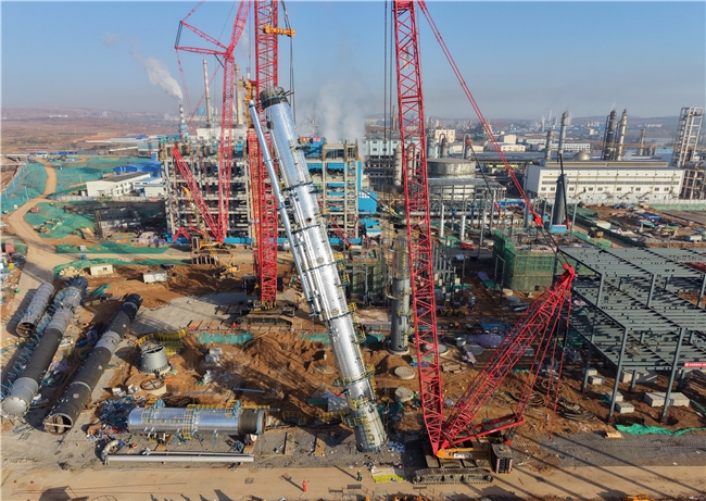 此次吊装的 HS 浓缩塔下段长 53 米、重达 175 吨,施工环境复杂、技术难度极高。项目团队采用 1600 吨履带吊主吊、500 吨履带吊溜尾的单主机抬吊递送法,精准避让 29 米高 CO₂解析塔下段,实现大型设备一次就位、完美精准,以硬核技术实力与高效协同作战,成功攻克关键设备吊装技术难关,充分彰显央企在高端化工工程领域的专业能力与核心竞争力。