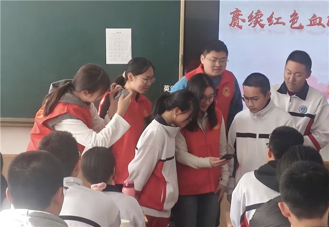 (图为团队成员在学校与学生宣讲红色精神时互动图片)