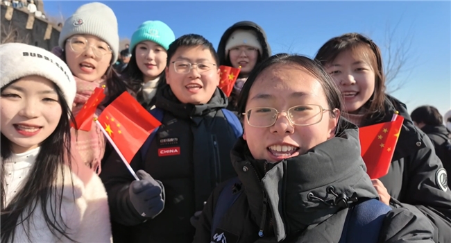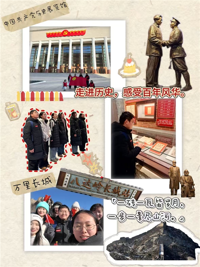 研学途中,团队登临万里长城,立于巍峨雄关之上眺望壮丽山河,胸中豪情激荡。成员们齐声朗诵《清平乐・六盘山》,“不到长城非好汉”的豪迈诗句穿越时空,将革命先辈的壮志豪情与新时代青年的使命担当紧密相连,高声歌唱《我爱你中国》,在诵读与歌唱中进一步坚定了文化自信与民族自豪感。
