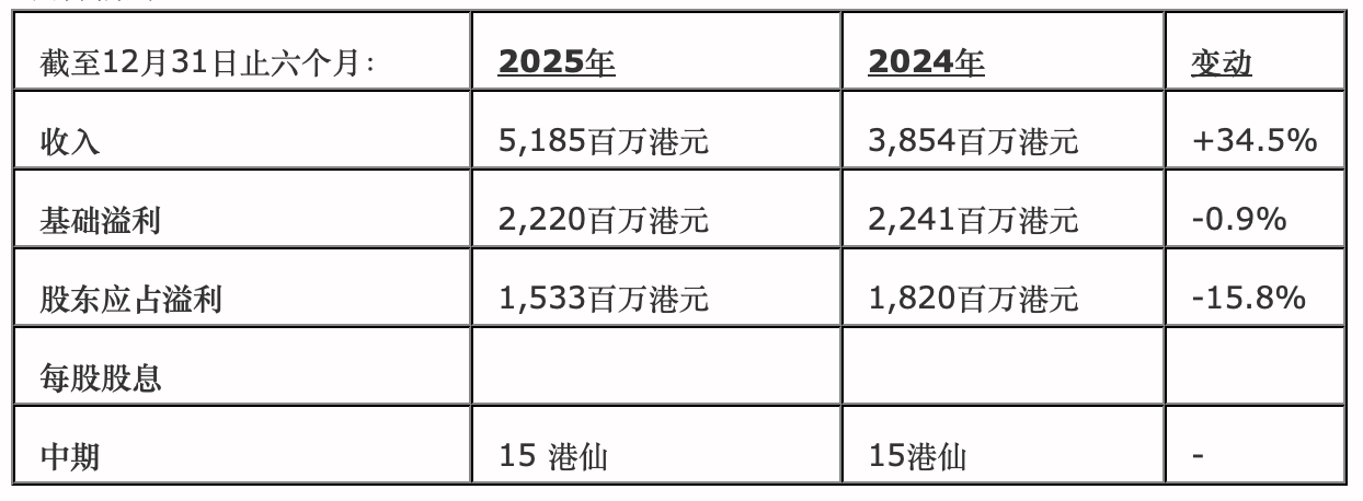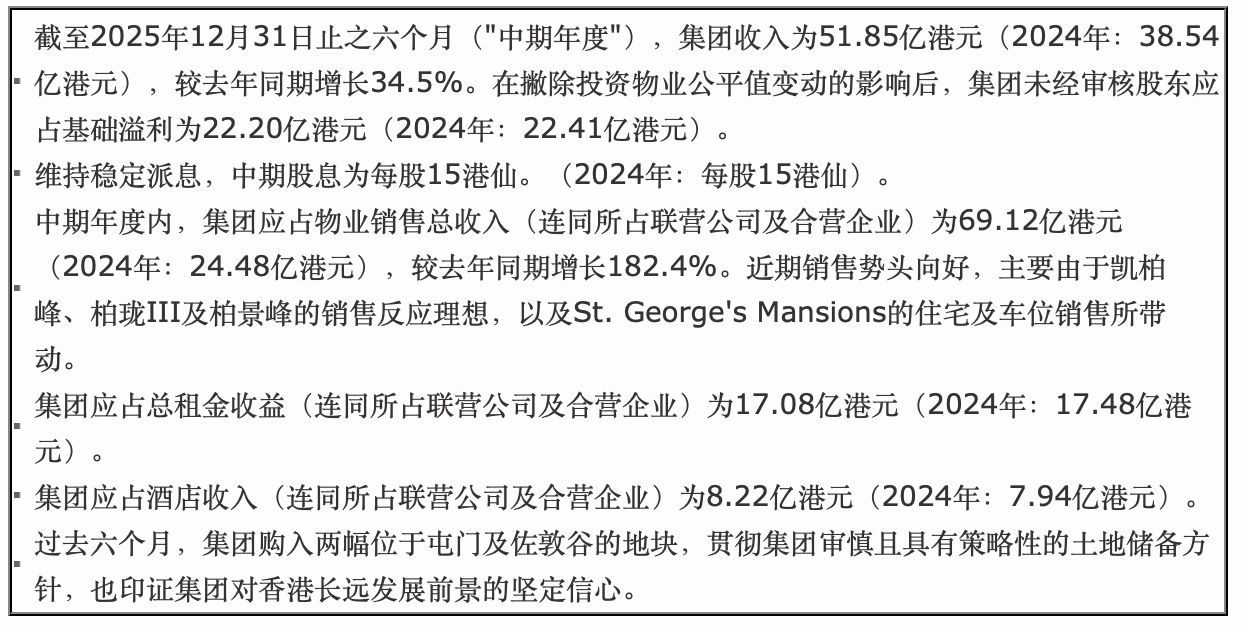 计及非现金项目的投资物业重估亏损(扣减递延税项)6.82亿港元(2024年:重估亏损4.07亿港元),中期年度集团股东应占净溢利为15.33亿港元(2024年:18.20亿港元)。每股盈利为0.17港元(2024年:0.21港元)。集团于2025年12月31日拥有净现金514.02亿港元。