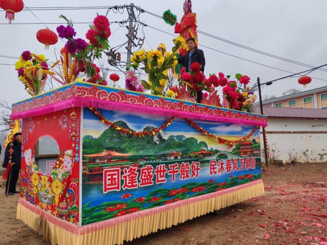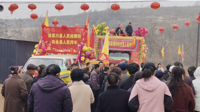 正因有这深厚的根基,场上的欢歌才如此踏实而奔放。巡游的社火车,是移动的华章。车身绘着青山绿水、亭台楼阁的画卷,而更为璀璨的,是车上高悬的对联:“国逢盛世千般好,民沐春风万象新。”“国安才有万民乐,家稳方得百业兴。”字字铿锵,如金石坠地。它们被高高擎起,穿行于细雨与人海之间。这不只是装饰,这是百姓将家园情怀与国运昌盛紧密相连的公开宣言。彩车上,盛装的演员如从年画中走出;车下,男女老少仰首观望,欢笑声交织升腾。就连“张家川县人民检察院”的拜年彩车,也与村庄的彩车并肩而行,法治的庄严与民俗的热烈在此和谐共鸣,勾勒出一幅“官民同乐、上下同心”的生动景象。