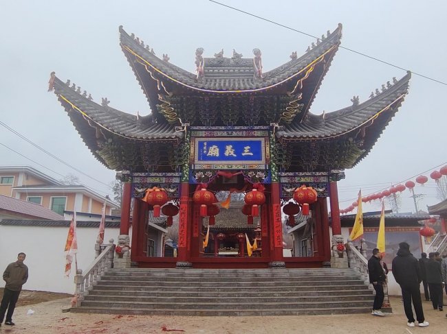 庙会灵魂的所在,是那座矗立于烟雨中的三义庙。古拙的飞檐挑着细雨,灰瓦被浸润得深沉肃穆,而那蓝底金字的“三義廟”匾额,却愈发显得庄重辉煌。庙名“三义”,源自三国时期刘备、关羽、张飞桃园结义的千古佳话。三位豪杰“同心协力,救困扶危”的誓言,早已超越历史,凝练为“忠、义、仁、勇”的精神符号,在这偏远的乡间被虔诚供奉。门前红彤彤的灯笼,将暖光洒在石狮威严的面庞上,也洒在每一位拾级而上的乡人肩头。