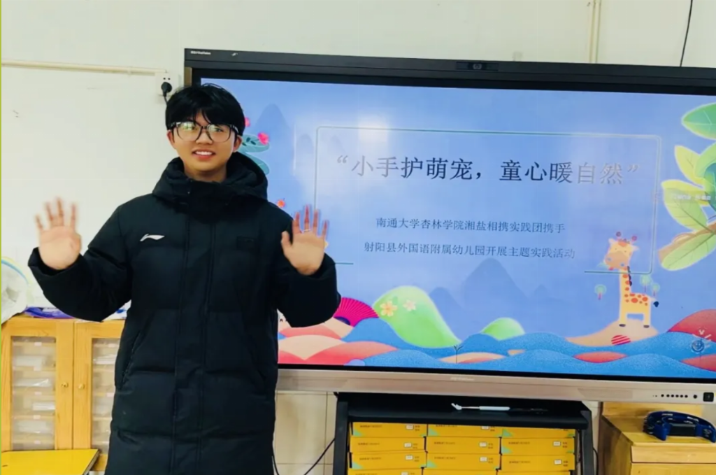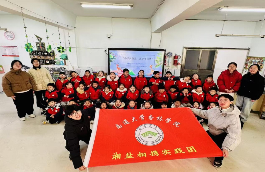 为引导儿童树立尊重生命、关爱自然的意识,进而在幼小心灵中播下共情生命、担当责任的种子 。2026年1月23日,南通大学杏林学院湘盐相携实践团走进射阳县外国语学校附属幼儿园开展“小手护萌宠,童心暖自然”社会实践活动,开启一场关于生命与爱的温暖探索之旅。此次活动由队长张堂建主持,湘盐相携实践团全体成员参加。