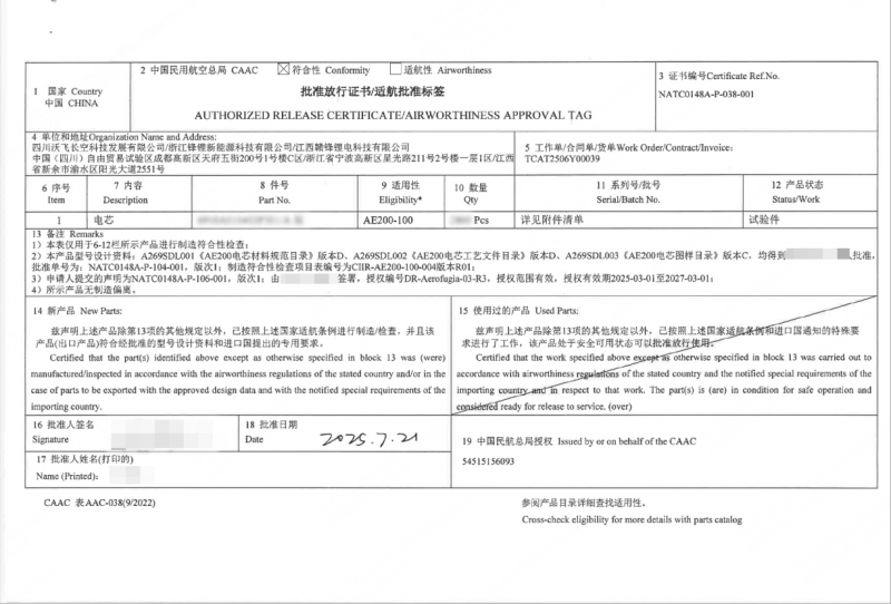 以技术突破为核,以模式创新为翼,以标准引领为纲,双方的合作已实现三位一体的跨越式发展,为行业树立全新范本。在技术维度,双方研发的航空级电芯采用固液混合电解质与软包封装技术,在保障高能量密度与高倍率输出的同时,大幅提升安全性能,有效降低热失控风险,此次交付的红标件更是通过极端弯折、撞击、挤压等航空级安全测试,为后续适航取证奠定坚实基础;在模式维度,合作延伸至电芯检验、维修、回收等全生命周期业务,构建从锂资源原材料到售后的完整产业闭环,整合上下游优势推动航空级电芯批量化生产与成本下降,惠及低空经济全产业链;在标准维度,AE200-100 所用电芯率先通过中国民航总局制造符合性检查,成功实现从车规级到航空级的跨越,为行业建立起可参考、可复制的航空级电芯标准体系,推动行业发展走向规范化、体系化。