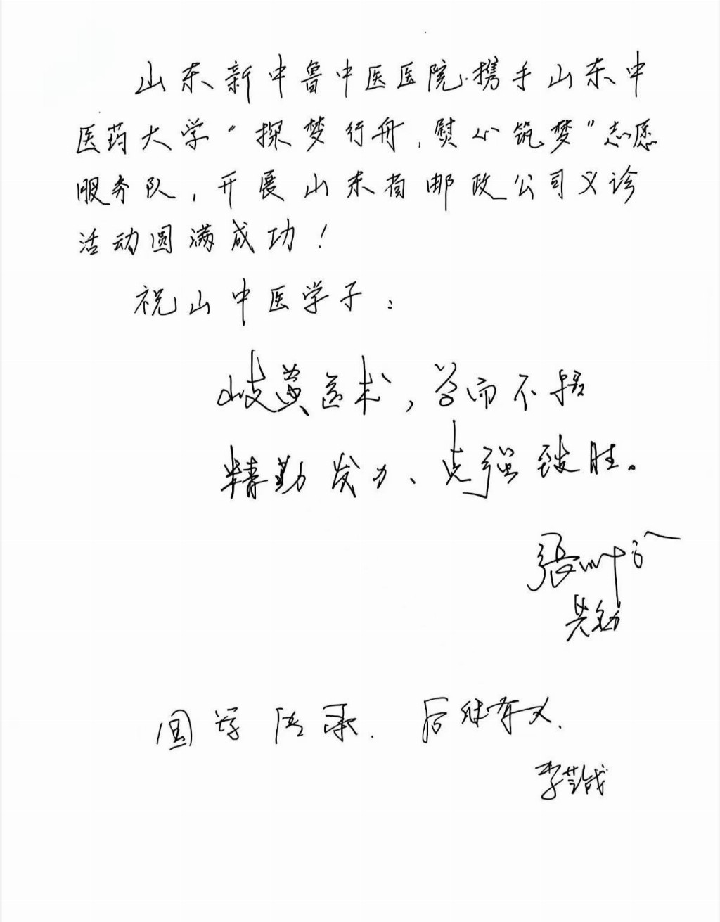 在志愿服务结束后,本次义诊领衔专家,山东省中医药文化传播学会会长,山东中医药学会副会长,山东中医药大学副校长张成博主任,以及中医世家、临床经验极其丰富的李艺战主任为山东中医药大学的同学们留下殷切祝福。