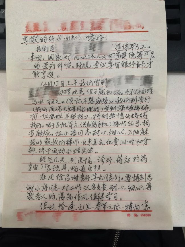成功办结的那一刻,老人紧锁的眉头终于舒展,脸上露出了如释重负的笑容。后续,老人在医院门诊、药店买药时,顺利享受医保统筹政策,这份切实的便利让老人愈发感念贵阳珠江路支行的暖心服务。于是,他提笔写下感谢信,用质朴的文字,赞扬这份用心服务。