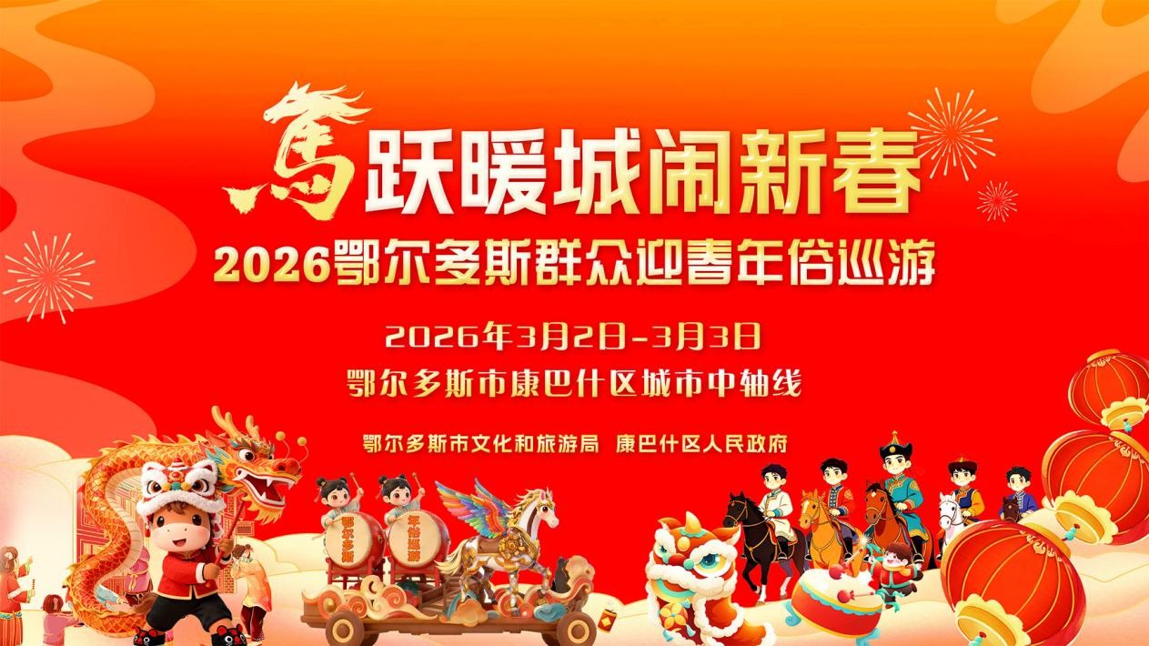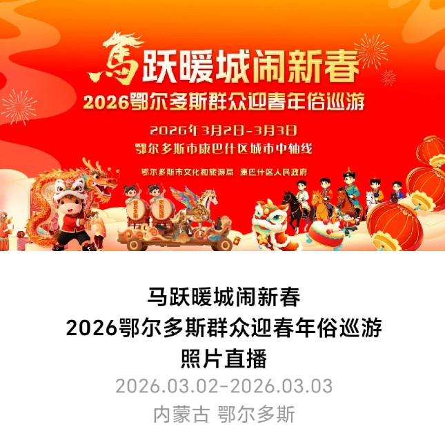 3 月 2 日 - 3 日(正月十四至十五),由鄂尔多斯市文化和旅游局、康巴什区人民政府主办的 “马跃暖城闹新春” 2026 鄂尔多斯群众迎春年俗城市巡游秀,将在康巴什区城市中轴线盛大启幕。