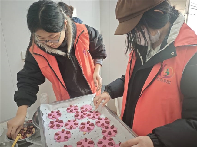 图为队员和家园师生制作桃酥。马秋菡 供图