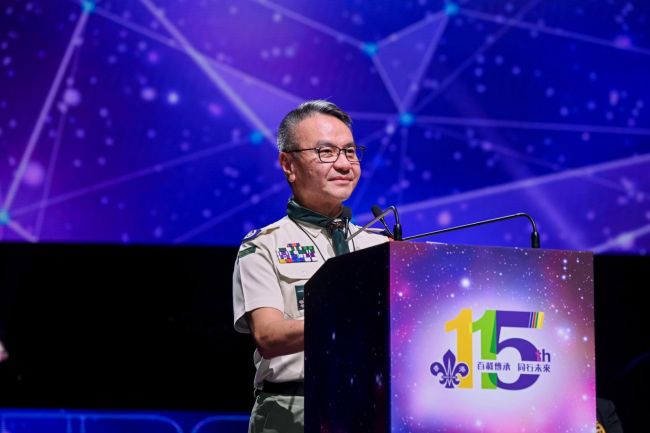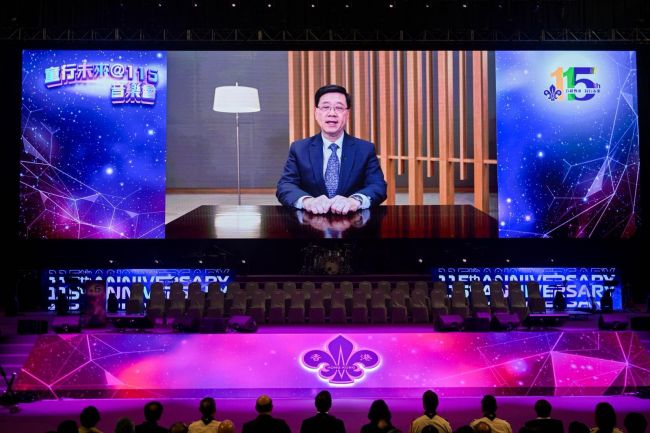 香港童军总领袖、香港特别行政区行政长官李家超先生,大紫荆勋贤,SBS, PDSM, PMSM透过视像短片致辞恭贺香港童军总会,表示香港童军体现了「马无惧山高路远、坚毅拼博、奋力前行」的精神,在历险训练中锻炼自我,不怕挑战;在社会服务中尽心竭力,不畏艰辛。这份精神跨越世纪,历久弥新。115年来,一代又一代的青少年透过童军训练,学会在逆境中昂首阔步,在磨练中茁壮成长,蜕变为自立自强、乐于助人、有责任感及勇于担当的人,正正是香港童军总会把这份精神传承下去。」李家超又提到,童军会是全港规模最大的青少年制服团体。多年来,在引领青少年成长及促进全人发展方面,发挥了重要的作用,并广受社会各界的认同及支持,同时亦与政府的青年发展理念契合,相辅相成。