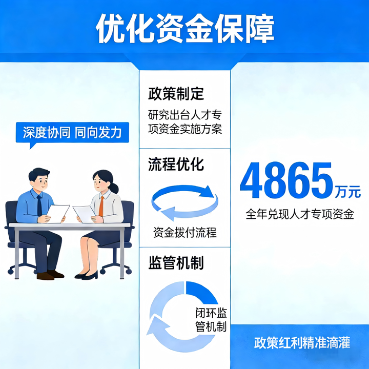 区委人才办与区财政部门深度协同、同向发力,研究出台人才专项资金实施方案,优化资金拨付流程、健全闭环监管机制,确保资金及时足额拨付到位,全年兑现人才专项资金4865万元,实现政策红利精准滴灌。