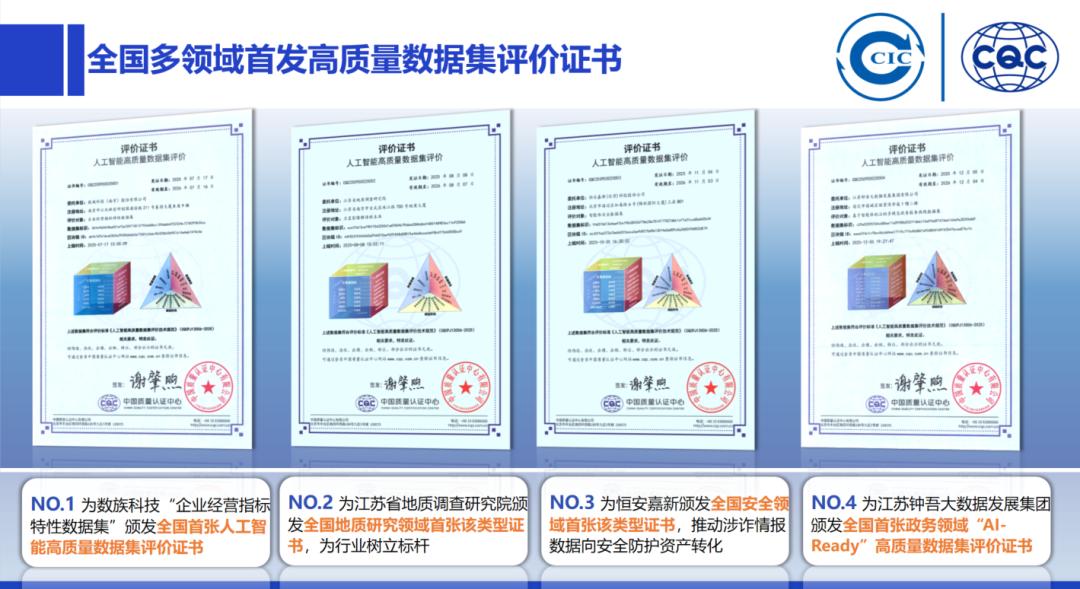 随着人工智能发展,我们积极响应国家“人工智能+”行动,立项研发人工智能高质量数据集相关评价。截至目前,已发布到第四批证书,整体通过率约30%,相关新闻已在网上发布。例如,首张人工智能高质量数据集证书颁给了江苏的企业——数族科技(江苏省数字经济学会会员单位),其凭借企业经营指标特性数据集获证。