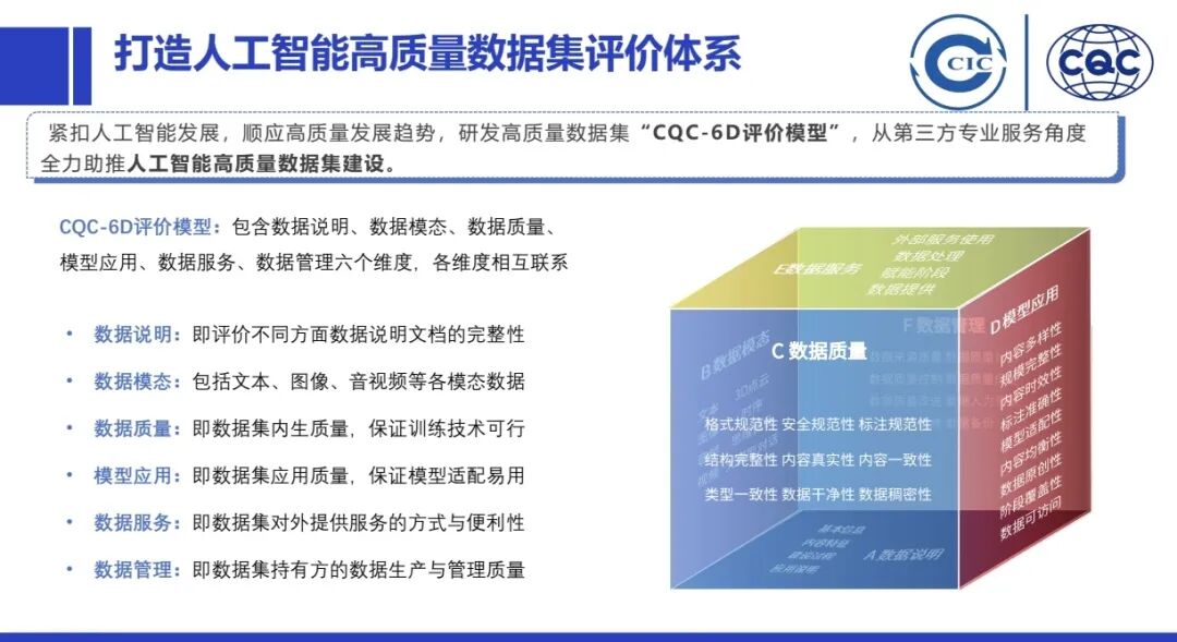 ——"CQC-6D评价模型"主要从数据说明,数据模态,数据质量,模型应用,数据服务,数据管理六个维度评估高质量数据集,对齐了国家数标委的相关技术文件以及最新技术标准的动态,也满足国家数据局刘局长提到的三个递进要求。