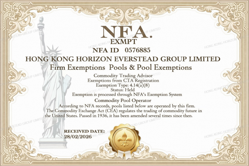 2026年2月28日,香港远恒集团有限公司(HONG KONG HORIZON EVERSTEAD GROUP LIMITED)宣布,集团已在美国 National Futures Association(美国国家期货协会NFA)备案系统中完成 Commodity Pool Operator(CPO商品池运营商)与 Commodity Trading Advisor(CTA商品交易顾问)相关牌照资质豁免备案登记,NFA ID:0576835 ,并纳入美国商品期货交易委员会 Commodity Futures Trading Commission(CFTC)监管框架管理。