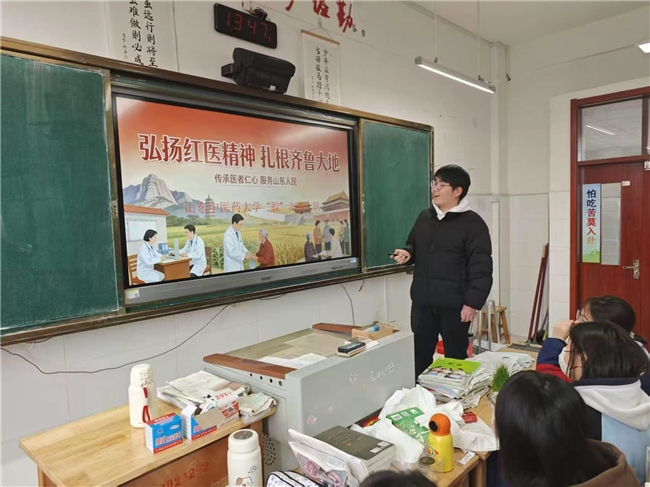 2月2日上午,实践队走进聊城一中高一(3)班教室,为这里的中学生带来了一场别开生面的红色文化宣讲活动。作为从聊城走出的学子,山东中医药大学的宣讲员们以“学长学姐”的身份,用贴近学生的语言,讲述了发生在聊城这片热土上的革命故事和英雄事迹。他们鼓励学弟学妹们,红色文化并非遥远的历史,它就蕴藏在脚下的土地和家乡的英烈身上。宣讲最后,队员们寄语中学生,希望他们能从家乡的红色文化中汲取力量,将爱国情、强国志转化为刻苦学习的实际行动。活动现场气氛庄重而热烈,一颗颗红色的种子在青少年心中悄然种下。
