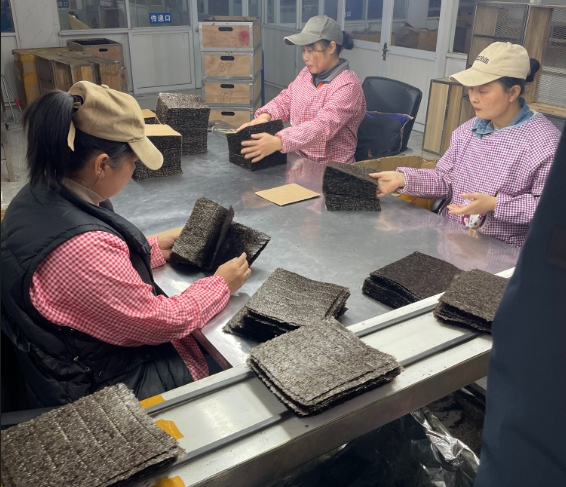 2月29日至3月1日,团队先后走访赣榆区多家海苔加工厂,全程见证海苔从原料处理、烘烤调味到包装成品的完整生产过程。队员们与企业技术人员深入交流,了解当前海苔加工行业在自动化设备应用、品质控制、品牌建设等方面的探索与实践。针对调研中发现的技术应用不足、品牌营销薄弱等问题,团队成员结合所学专业知识,提出优化生产流程、加强新媒体宣传等建议,并记录形成产业升级调研素材,为后续撰写《连云港乡村实践案例集》积累一手资料。