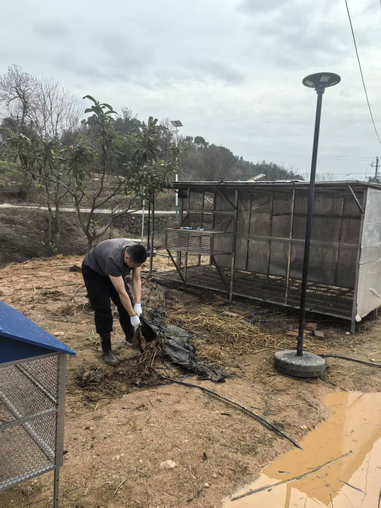 在乡邻的养鸡场里,旷财智主动承担起防草布清理与围栏填制工作。他认真清理场地内的旧防草布,将新的防草布平整铺设并固定牢固,细致加固每一处衔接点,有效防止鸡群逃跑,为乡邻的养殖生产筑牢安全防线,用踏实劳动减轻了农户的负担。