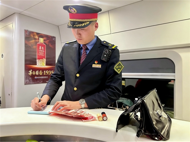 春运返程途中,旅客遗失物品时有发生。守护旅客财物,护航平安归途。列车长在车厢内仔细清点、认真登记旅客遗失的现金与物品,一笔一划记录详情,用心尽责,让遗失的温暖顺利回家,确保失物能尽快物归原主。