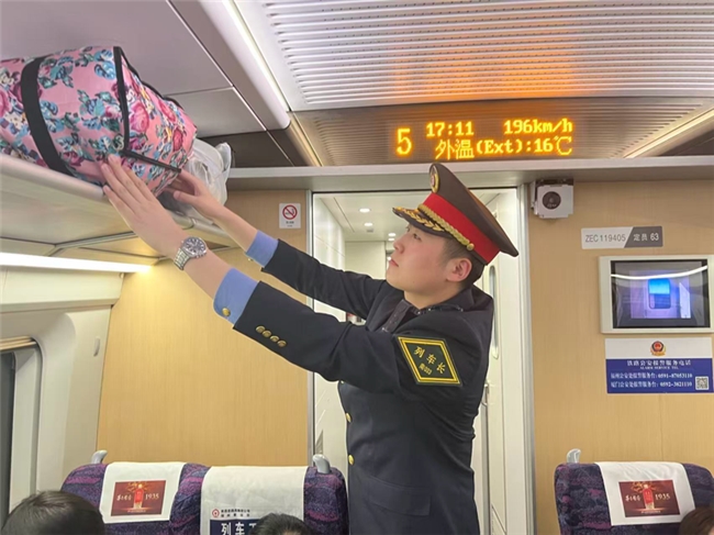D3236次列车上,列车长正在车厢内协助旅客整理行李架。针对春运期间行李多、摆放杂的特点,他把杂乱归位,让安心随行,用每一个细微动作,为每一位归乡人筑牢旅途安全防线。及时整理大件行李,消除行车安全隐患,确保旅客出行安全。