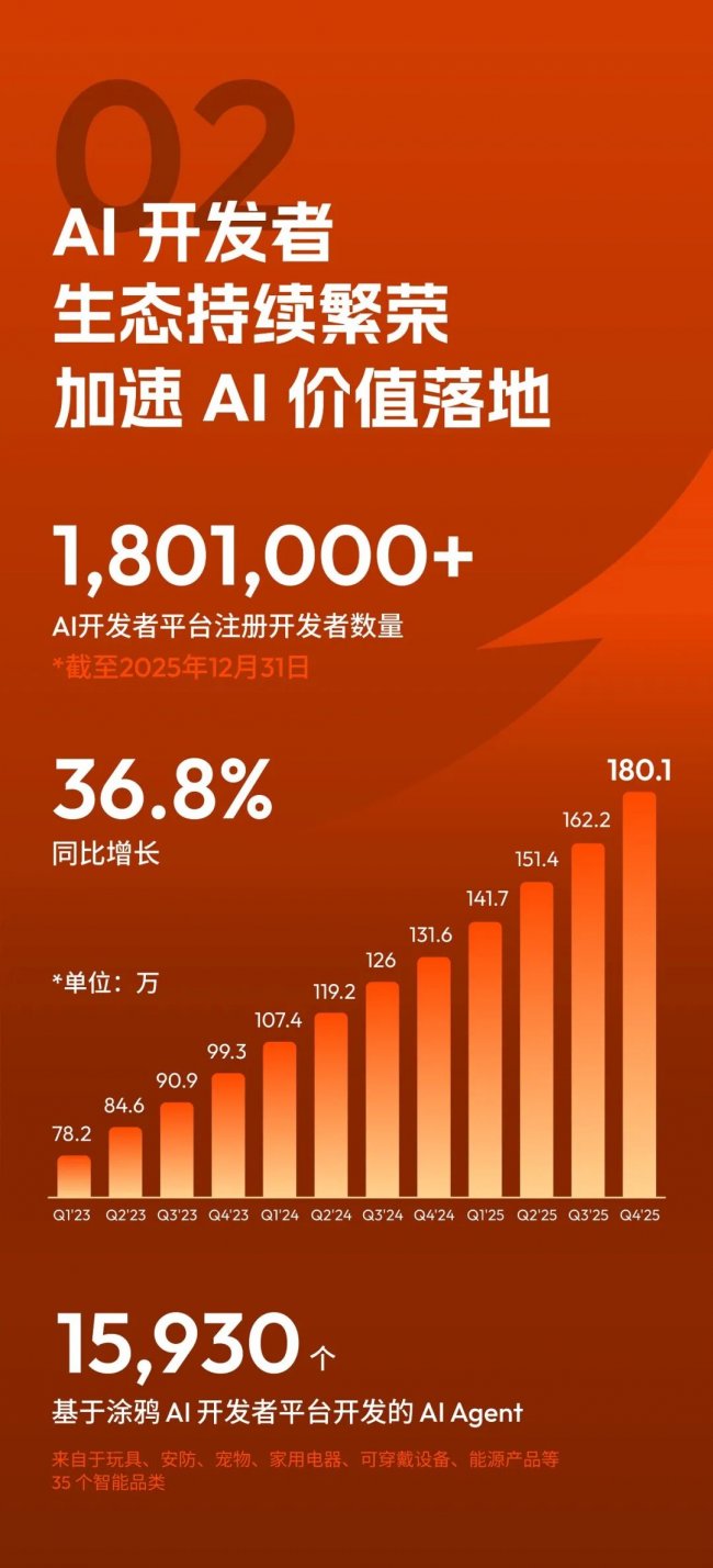 作为领先的AI开发者平台,截至2025年12月31日,涂鸦智能注册开发者数量超过180.1万,较2024年底的131.6万增长36.8%。基于涂鸦AI开发者平台累计开发的AI Agent数量已达15930个,覆盖众多智能产品品类。