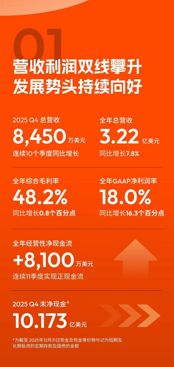 截至2025年12月31日,公司净现金(即现金及现金等价物与记为短期及长期投资的定期存款和国债)总额约10.173亿美元,充足的资金储备为公司长期发展和产品、技术创新提供有力支持。