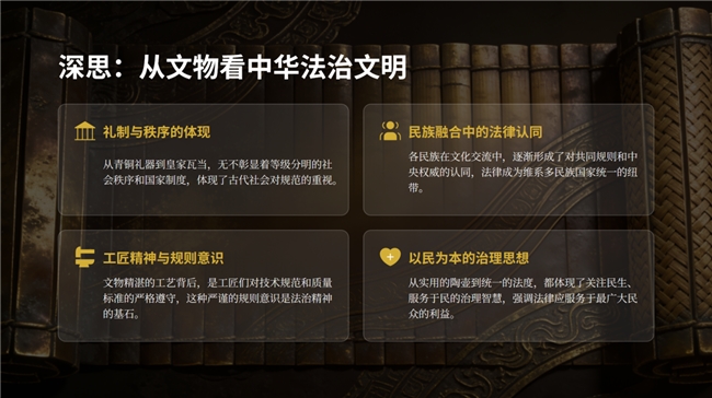 此次四地博物馆考察,是“法润文脉”实践团队探寻中华文脉的重要一步。团队将所见所感系统梳理,制作成宣讲PPT,从文物中提炼出“礼制与秩序”、“民族融合中的法律认同”、“工匠精神与规则意识”及“以民为本的治理思想”四大法治内涵。未来,团队将以PPT为载体,开展普法宣传与文化沙龙,让古老的智慧在新时代绽放新的光芒,以青春之力传承和弘扬中华优秀传统文化,为新时代法治文化建设贡献力量。