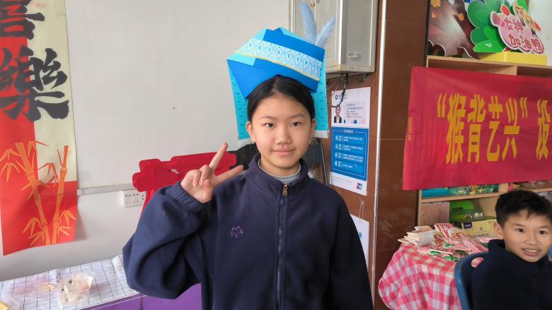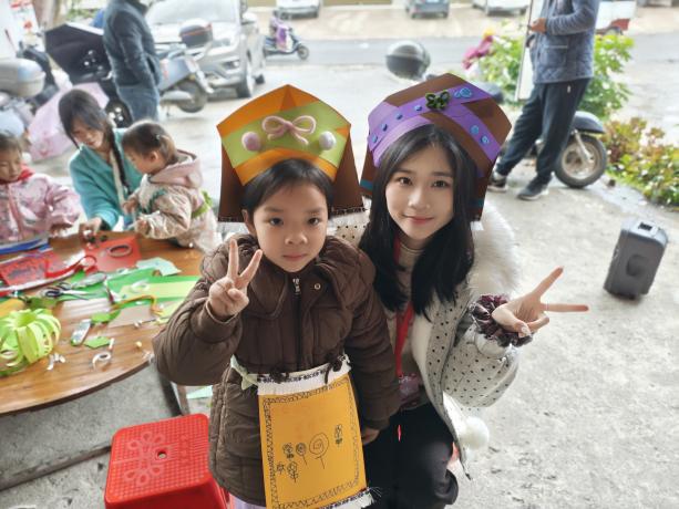 期间,实践团转赴柘木镇窑头村儿童之家,开展瑶族服饰手工制作课程。孩子们在实践团指导下亲手制作瑶族风格围裙与帽子,体验瑶族服饰工艺的独特魅力。瑶族女性服饰注重腰部以下装饰,围裙上常绣有精美图案;儿童帽则多以铃铛、铜钱等装饰,寓意吉祥辟邪。实践团准备了安全易操作的材料,让孩子们在裁剪、粘贴、装饰过程中深入了解瑶族服饰文化。