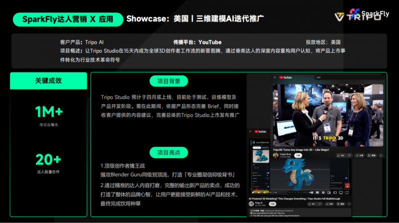 第一,高效的圈层穿透,项目实现总曝光超过100万,覆盖全球核心3D创作者社群。更为关键的是,这些曝光不是泛流量,而是精准触达目标用户的YouTube评论区中,大量用户留言“这是我今年见过最激动人心的工具”“已经加入我的工作流”;第二,深度的信任传递,超过20位垂类达人批量合作,其中包含多位圈层顶流。这些创作者的背书,为Tripo建立了难以复制的信任资产;第三,完整的心智占领,Tripo成功完成了从“新工具”到“新符号”的跃迁。在各大创作者社群中,Tripo成为热议话题;在专业论坛中,用户开始自发分享使用心得;在YouTube上,大量UGC教程涌现。品牌真正进入了创作者的心智,成为他们创作叙事的一部分。