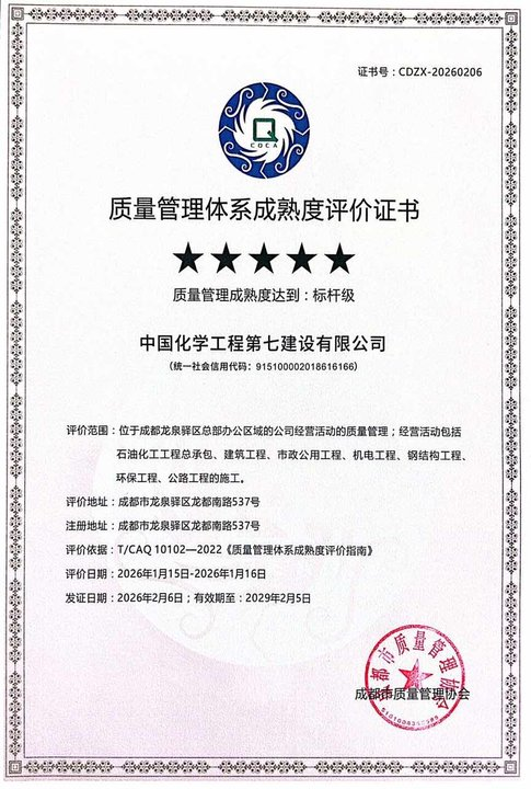 中国化学工程七化建继1月中旬顺利完成质量管理体系成熟度外部评价工作后,近期正式获得了成都市质量管理协会授予的“质量管理体系五星级成熟度”评价证书。此项荣誉不仅是对七化建长期坚持“以质取胜”战略的高度认可,也是对全体员工深耕质量文化、践行卓越管理的充分肯定。