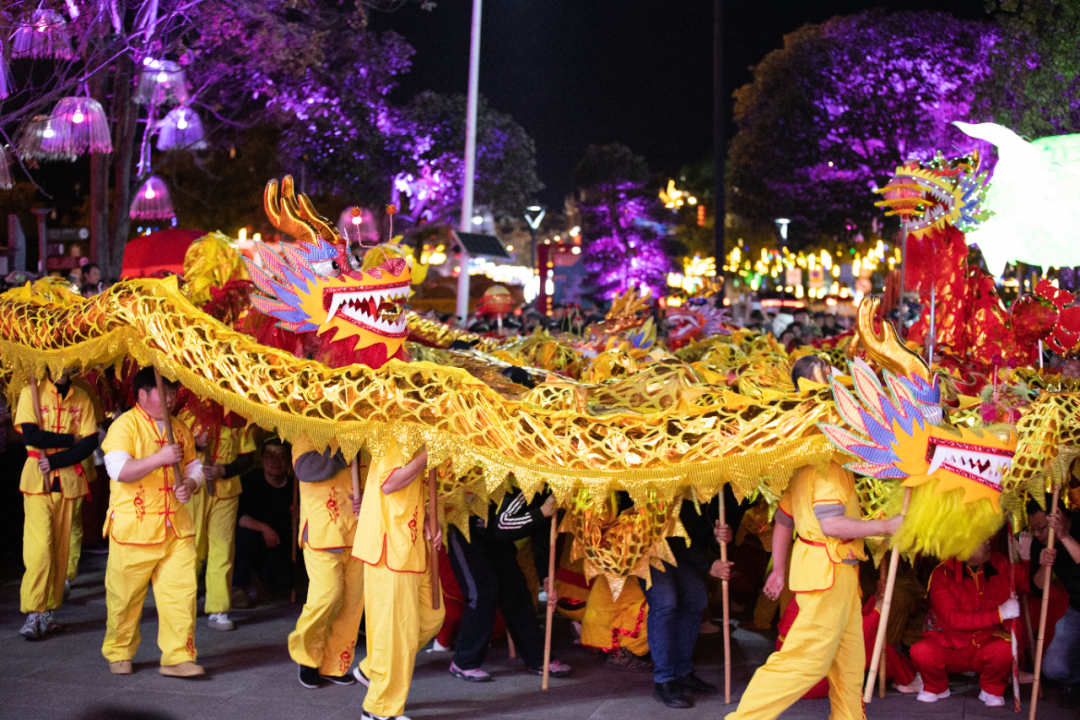 当晚18时30分,随着铿锵有力的锣鼓声响起,舞龙巡游正式拉开帷幕。舞龙队伍分别从标志门和区政府大院出发,沿着城区主干道、索溪河畔及商圈景点欢舞前行。祥龙翻腾,气势磅礴,锣鼓声与欢呼声交织在一起,吸引了众多中外游客驻足观看,不少人还跟着队伍一路欢腾,共同沉浸在这浓厚的节日氛围中。