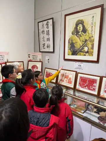 学生们在讲解员带领下参观了雷锋角,首先一幅《雷锋握枪》的作品打开的小朋友的话匣子,让人想不到的这不是照片而是复刻剪纸作品;今天发行的《雷锋》邮资机戳也是用了四幅单色,多色《雷锋》剪纸与张乐平先生的《三毛学雷锋》连环画有机结合;雷锋角展示了第一个画《雷锋》连环画汪观清先生“雷锋精神永放光芒”书法,雷锋角还展示了《雷锋》故事机(八个故事,十首歌曲)是红色少年邮局开展二千个雷锋故事机西部行与东西部学生交流交往捐赠品;雷锋角展示的雷锋书签是红色少年邮局向西部和市民开展送书签活动制作的。雷锋角还展示了十二届全国政协副主席王家瑞的回信和签名封,同时还展示了《雷锋》文创产品,邮资机戳,书签,有声火柴盒,有信明信片,纪念戳章,徽章,茶饼,交通卡,地铁卡,剪纸等。