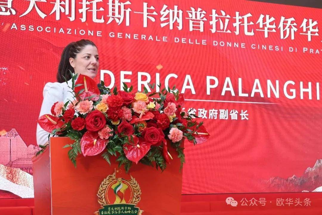 ▲普拉托副省长Federica Palanghi 致辞。Federica Palanghi 副省长代表Simone Calamai 省长向普拉托妇女总会的成立表示热烈祝贺。她表示,基于相互尊重与理解,不同文化背景的人们能够携手创造更加美好的未来。社会中的每一个角色都在传递不同的价值观,而女性群体所展现出的责任、坚韧与温暖,正是社区发展不可或缺的力量。今天见证这一女性团体的诞生,是一件令人欣喜的事情。她期待未来在更多女性活动中,加强合作与交流,进一步促进侨界与当地社会之间的联动。