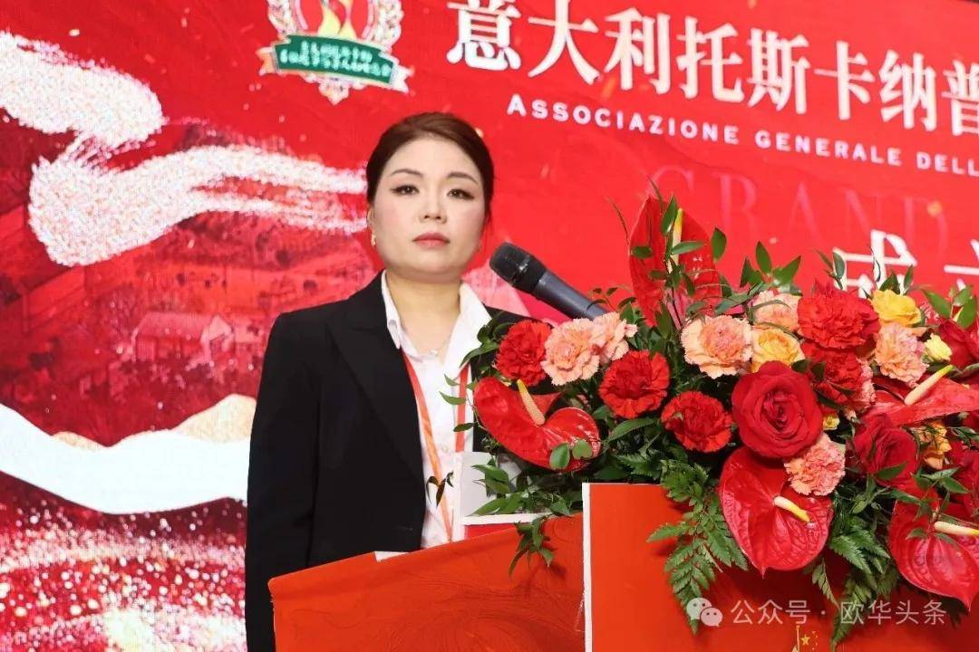 ▲意大利托斯卡纳普拉托华侨华人妇女总会青年部部长章余发表讲话。章余表示,新一代华侨华人青年将积极融入妇女总会发展,传承前辈精神,发挥桥梁作用,在中意文化交流与社会公益中贡献青春力量,让侨界巾帼事业薪火相传、持续发展。
