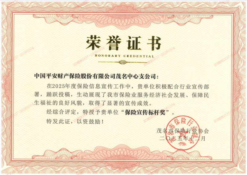 近日,平安产险茂名中心支公司凭借出色的宣传成效和积极的行业参与度,荣获茂名市保险行业协会颁发的“保险宣传标杆奖。这一荣誉不仅是对公司2025年在保险信息传播工作中卓越表现的充分肯定,更是对其持续服务地方经济社会发展、积极传递保险正能量的有力褒奖。作为行业宣传的排头兵,公司始终坚持“以客户为中心”的理念,主动融入行业宣传大局,用有温度、有深度、有广度的宣传实践,生动展现了现代保险企业的社会责任与价值追求。
