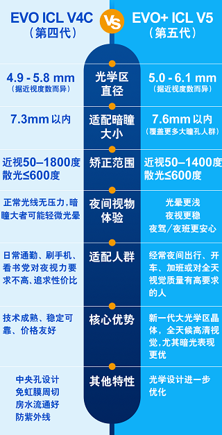 很多人会好奇,V5和V4c有什么区别?苏锐医生表示,V5晶体可以看作是从 “经典款” 升级而来的 “日夜全能高配款”,核心优势主要体现在V5晶体拥有更大的光学区域。夜间光线暗,人的瞳孔会自然放大,如果晶体的光学区不够大,就容易出现眩光、光晕等问题,影响夜间视力。对比数据显示,V4c晶体的角膜平面等效光学区直径为 7.3mm,而V5 晶体的等效光学区直径提升到了 7.6mm。在不同近视度数区间,V5 晶体的晶体光学区直径也全面优于 V4c。更大的光学区,能更好地覆盖夜间放大的瞳孔,有效减少眩光、光晕,让夜间视物更清晰、更舒适,特别适合经常夜间驾驶的人群。