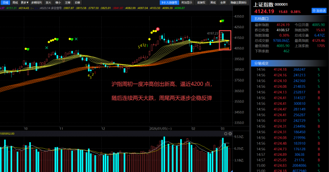 本周沪指周初一度冲高创出新高、逼近4200 点,随后连续两天大跌、跌破多条短期均线,周尾两天逐步企稳反弹,最终周K线以带有明显上下引线的小阴线报收。创业板指大体表现基本相似,总体呈现为震荡走低的节奏,最终周 K 线也以螺旋阴线收官。