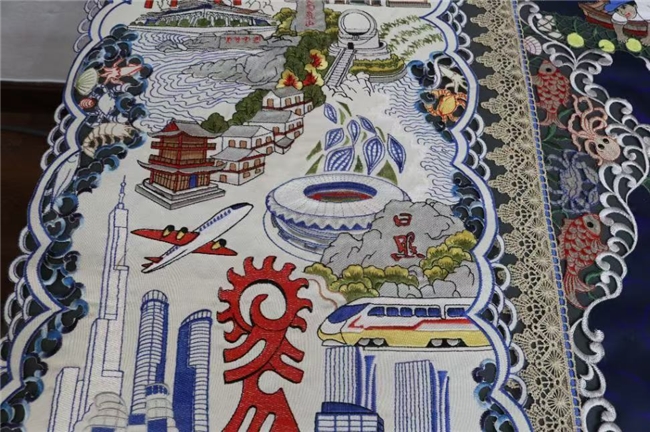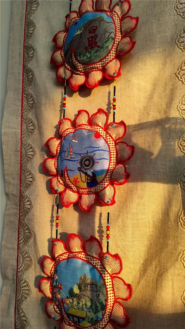 隔着玻璃,我们屏息凝视。那并非平面的绘画,而是用双股加捻棉线堆砌出的立体世界。讲解员告诉我们,这是日照鲁绣特有的质感——厚实、硬挺,色泽鲜艳而不失古朴。我们凑近细看,只见绣布上,帆船的轮廓并非平铺直叙,而是通过特殊的针法呈现出浮雕般的立体感。那扬起的风帆,仿佛真的在海风中鼓荡,每一根棉线都像是被赋予了生命,交织出海浪的纹理与光影。讲解员轻声介绍,这幅《扬帆》不仅寓意着“顺风顺水”,更凝聚了绣娘半个多月的心血,从构思配色到一针一线的堆叠,都是在用指尖丈量大海的辽阔。我们隔着玻璃,仿佛能触摸到那棉线微糙的质感,感受到绣娘在创作时那份对家乡海港的深情。