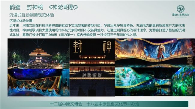 《神游朝歌》是河南文旅科技转型标杆项目,为中原文博会、中原民俗文化节举办地,年均接待客流35 万 +,获河南省文旅科技创新奖。雾隐门打造国内首创 260 米室内卷轴投影,以科技还原三千年朝歌文化,沉浸式互动剧情观览体验拉满,累计开展直播 356 场,全网总曝光超 2 亿次,成为新质生产力文旅代表项目,带动当地文旅消费增长 40%