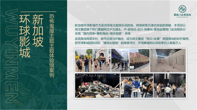 雾隐门承接新加坡环球影城热门 IP 恐怖鬼屋项目,该 IP 为阅文集团顶级悬疑网文,原著书粉达1138 万,全流程执行 IP 游戏化、设计、场景化与落地。采用 “国内预装 + 整柜海运 + 海外组装” 模式,实现高效跨国交付,细节高度还原 IP 内容,获国际团队 “精准如复制” 高度评价,成为阅文集团 “网文 + 实景” 跨国标杆案例,开馆峰值单日体验超万人,全网曝光量突破4000 万次,带动环球影城同期客流增长 25%。