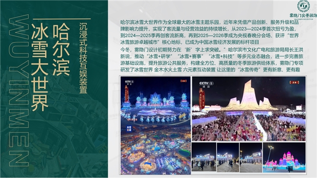 哈尔滨冰雪大世界为全球最大冰雪主题乐园、央视春晚分会场,2025 季 65 天接待游客达306 万人次,春节单日最高客流 12 万人次,入境游客增长百倍。雾隐门深度参与项目创新升级,专项研发冰雪六元素互动装置,贴合 “冰雪 + 研学 + 赛事 + 科技” 发展方向,该装置累计接待体验者超 50 万人次,互动参与率达 92%,以沉浸式科技互娱赋能冰雪经济,打造世界级冰雪文旅新体验。